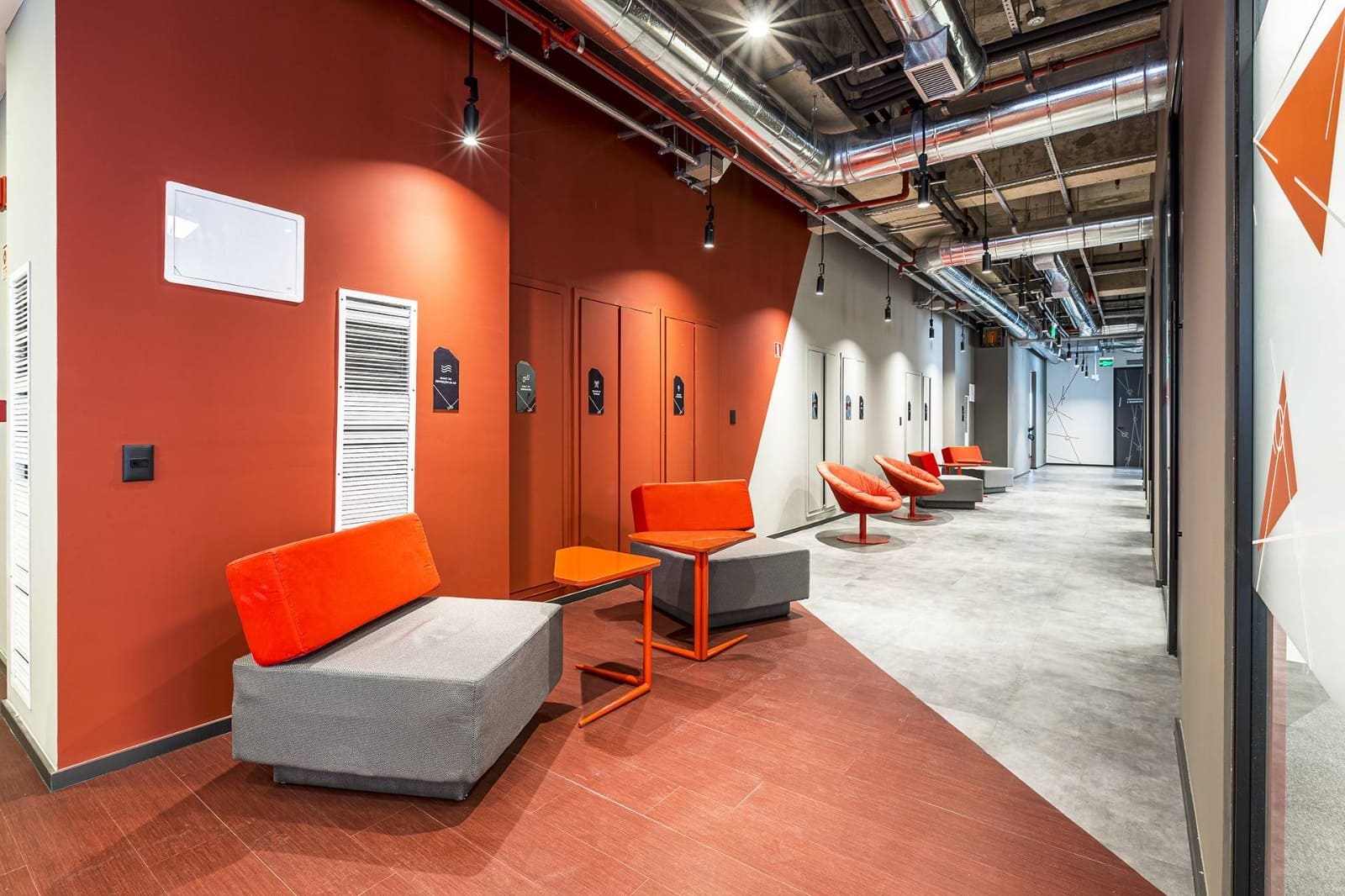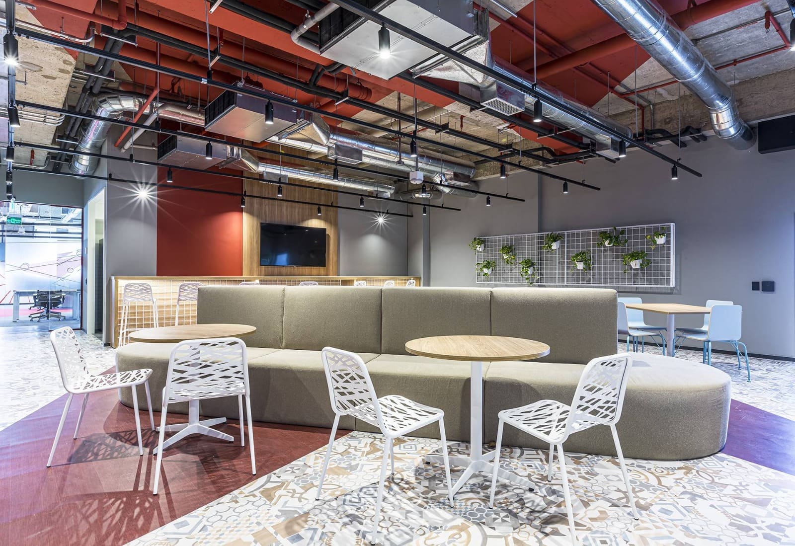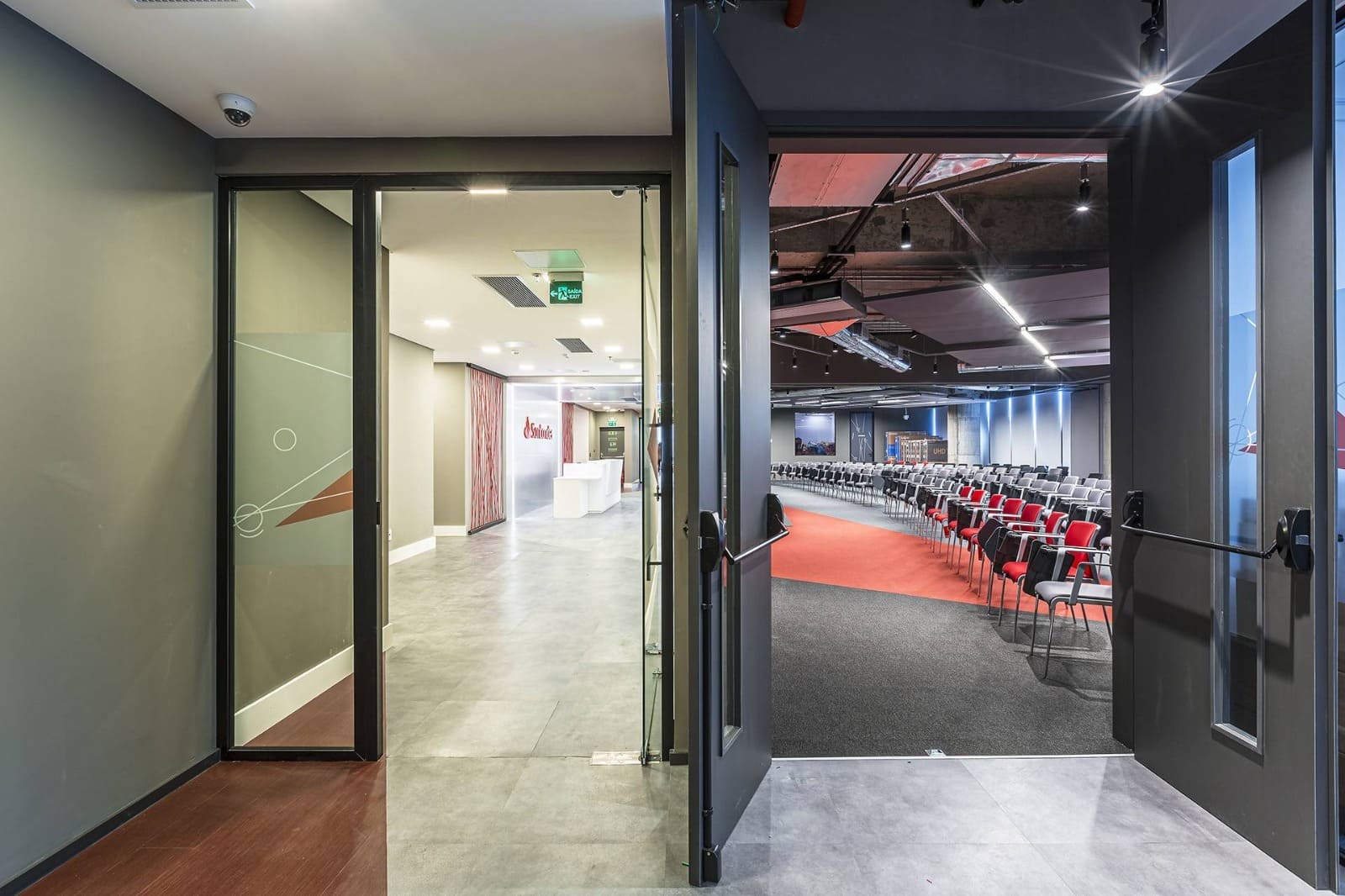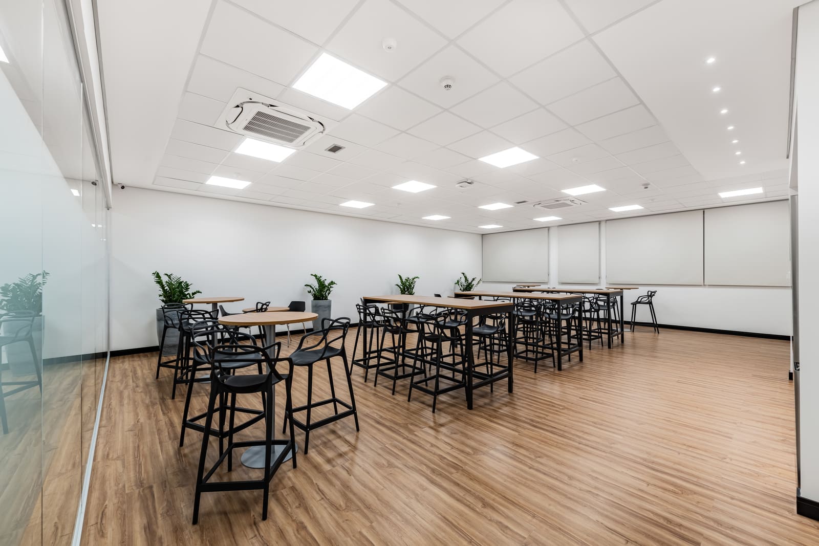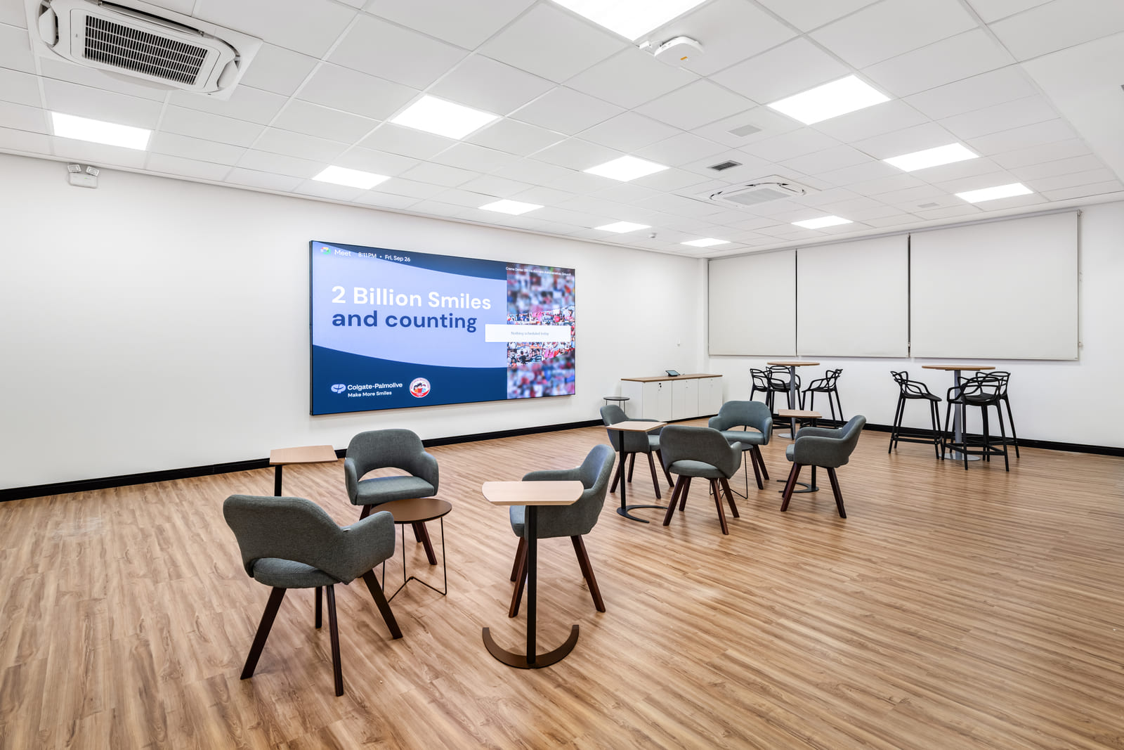Salas de conferência, auditórios, espaços para seminários, salas de treinamento, academias corporativas, cafeterias, restaurantes para funcionários, espaços de relaxamento e descanso.